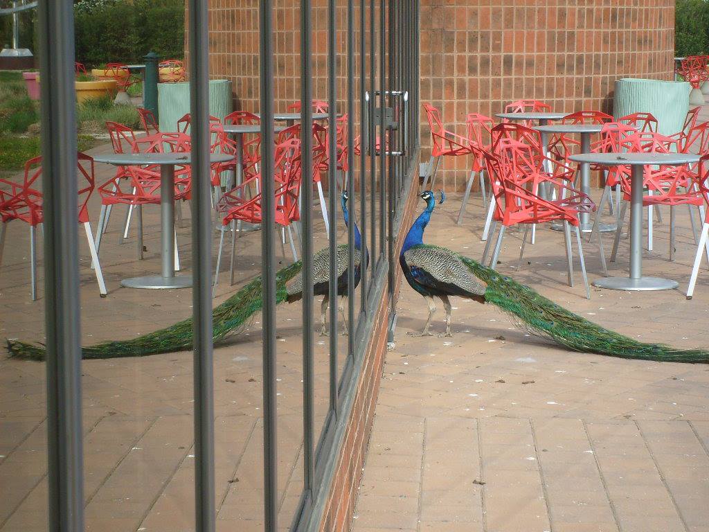 I am going to take these wonderings and write out a draft of a story about this peacock. . . and how possibly his friends are inside the café.